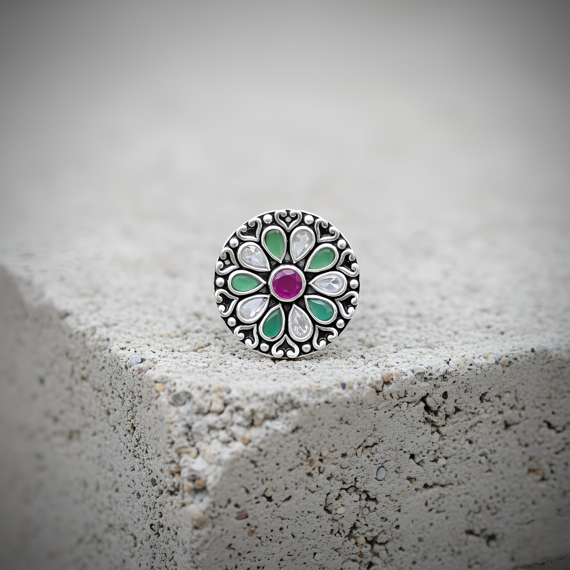 Crafted with detailed antique silverwork, this floral cocktail ring features vibrant green and pink stones that create a striking contrast. Designed as a statement piece, it combines traditional artistry with bold color accents, perfect for elevating formal and festive attire. The intricate floral motif enhances its timeless appeal, making it a refined choice for women seeking elegance with a touch of individuality.