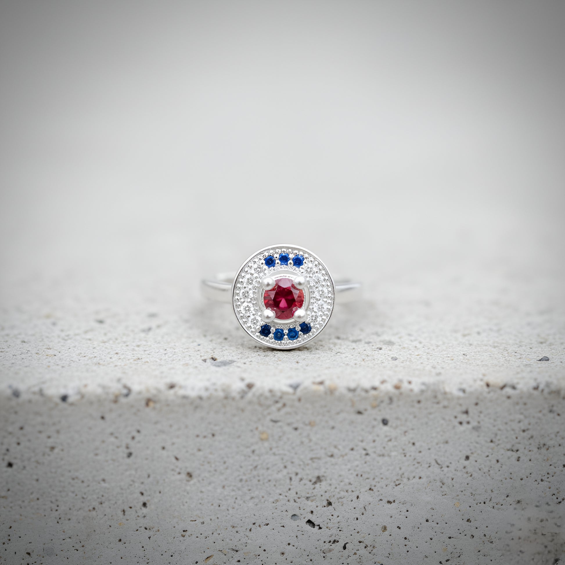 Silver Round Designer Ring with Blue and Ruby Center Stone | Women’s Silver Ring